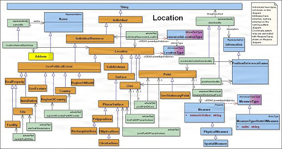 3. The lower left of the diagram is a model of types of Location objects. These can be alternatively named using the naming pattern in the upper left and delineated using the Extent pattern in the lower right.
